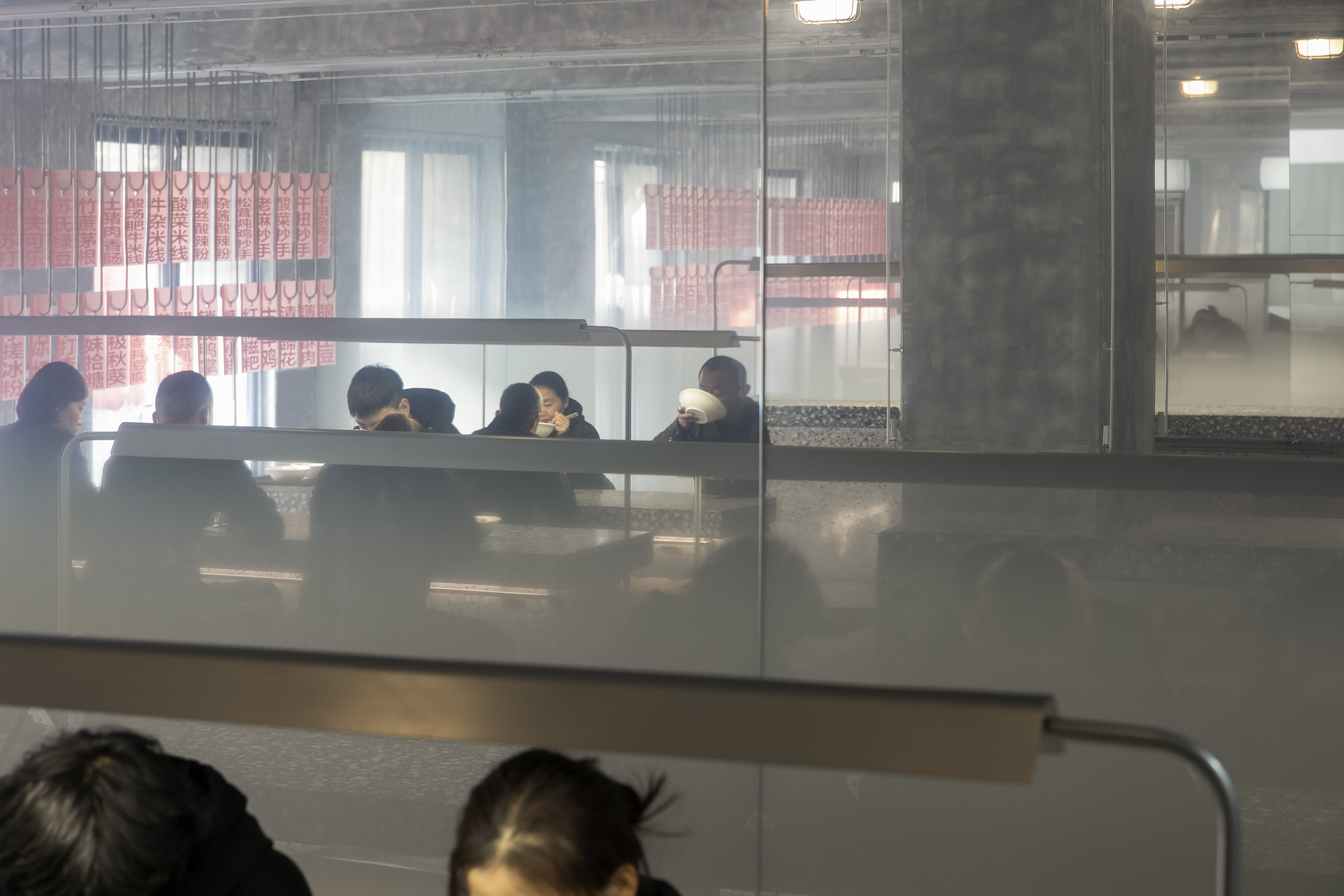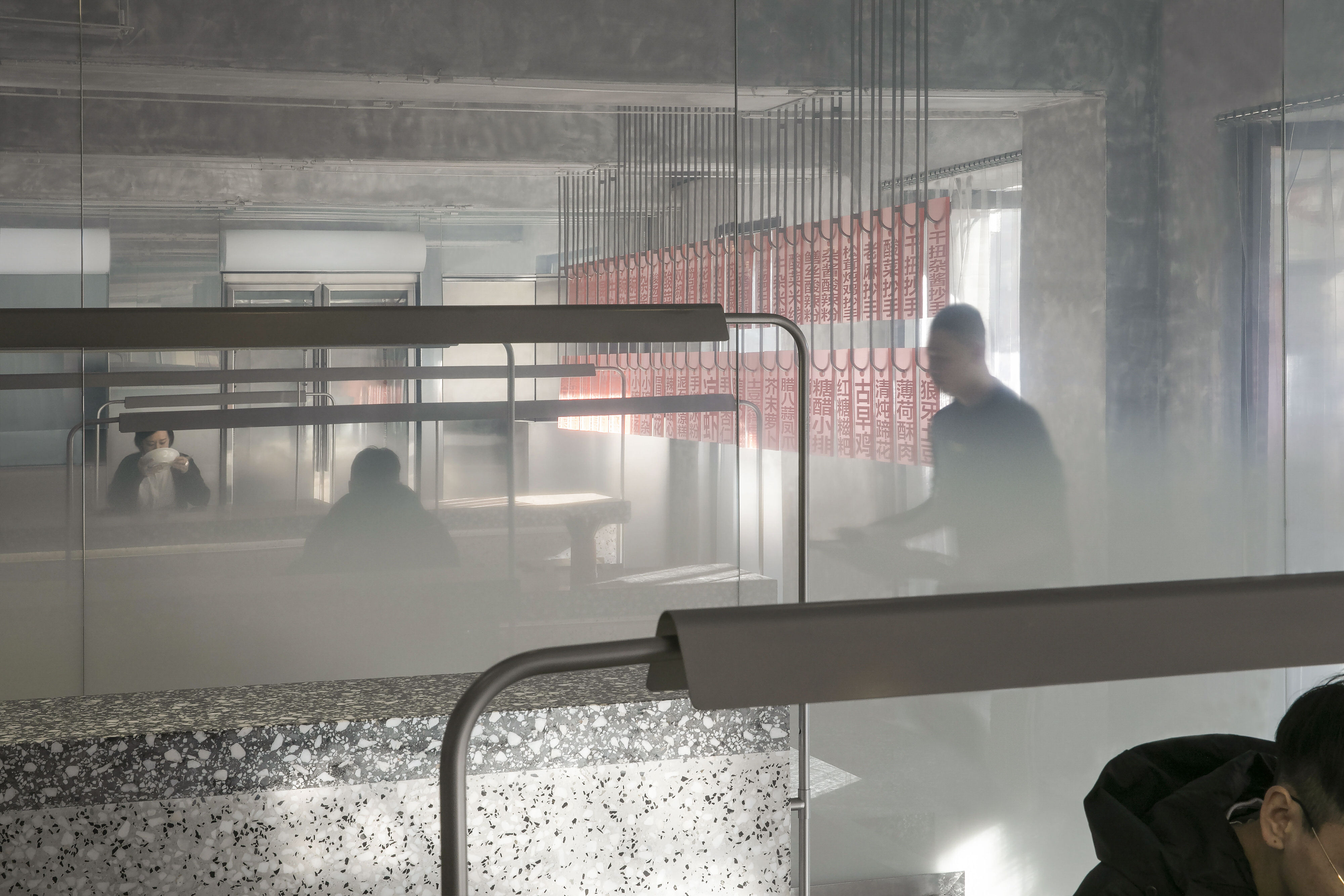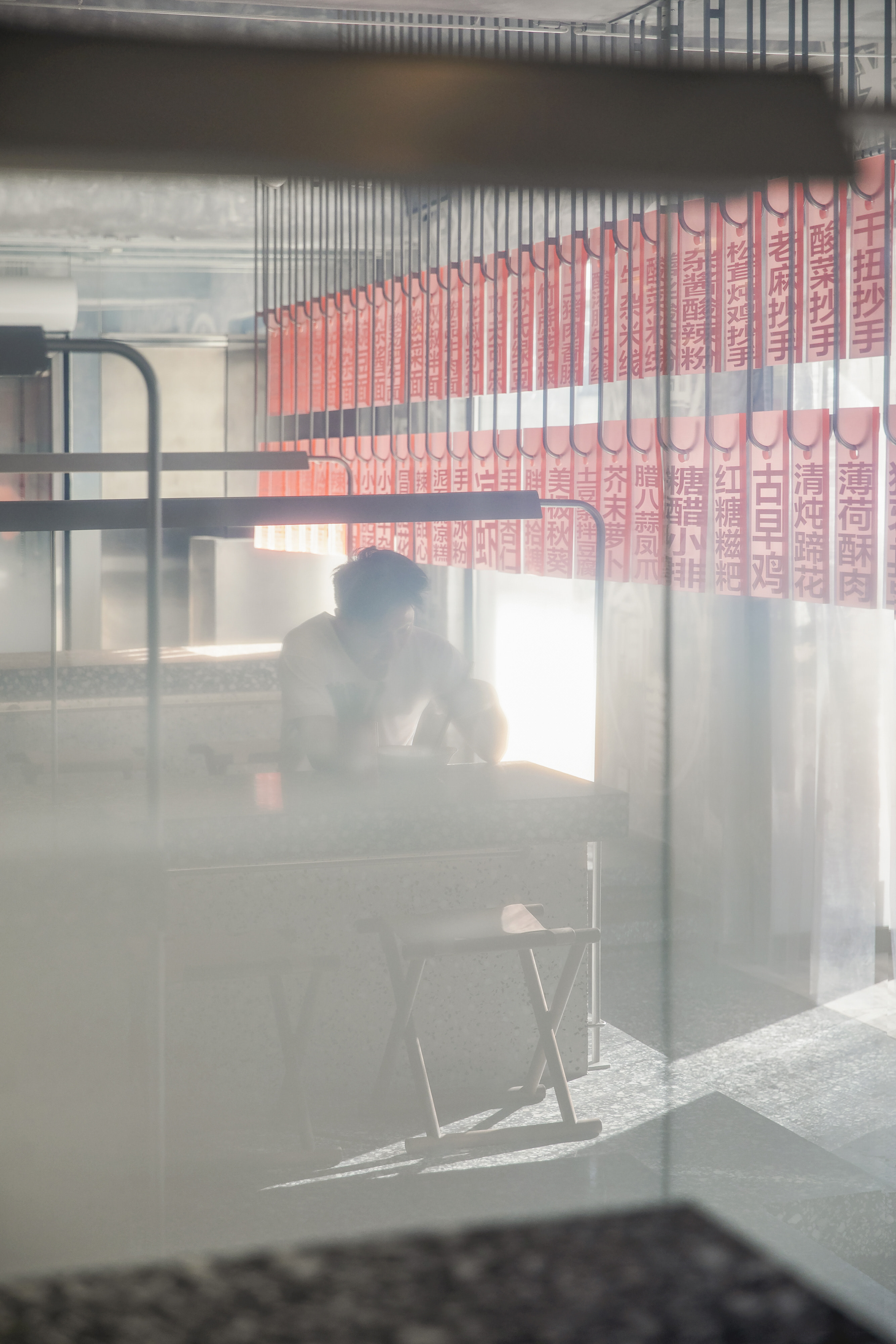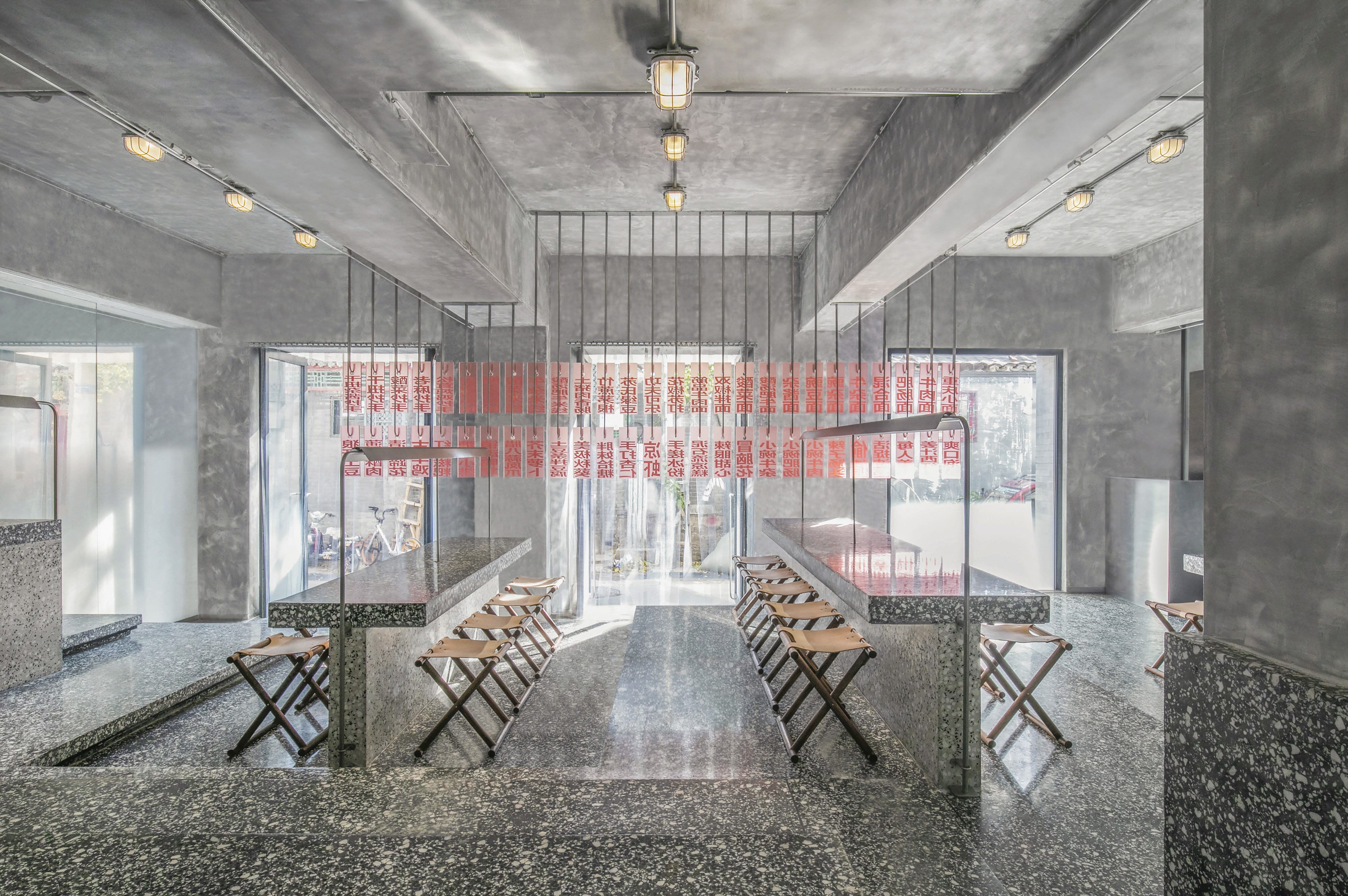 OFFICE AIO从摄影师Tim Franco、Nadav Kander和Mark Horn的作品中汲取灵感。他们的作品记录了重庆人们的日常生活,以都市和自然景观为背景,记录着这个错落有致,纵向层次丰富的城市。面馆150平方米的空间一分为三:其中,深处是横跨空间宽度的主厨房(55平方米),与之连接的是设有窗户面向街道的甜品和饮料制作区(15平方米),剩余的80平方米则作为用餐区。两个工作区和用餐区之间的内墙凿出了多个窗口,为终日繁忙的餐厅提供了极为高效和系统的工作流水线(每个座位翻台率仅为6分钟)。