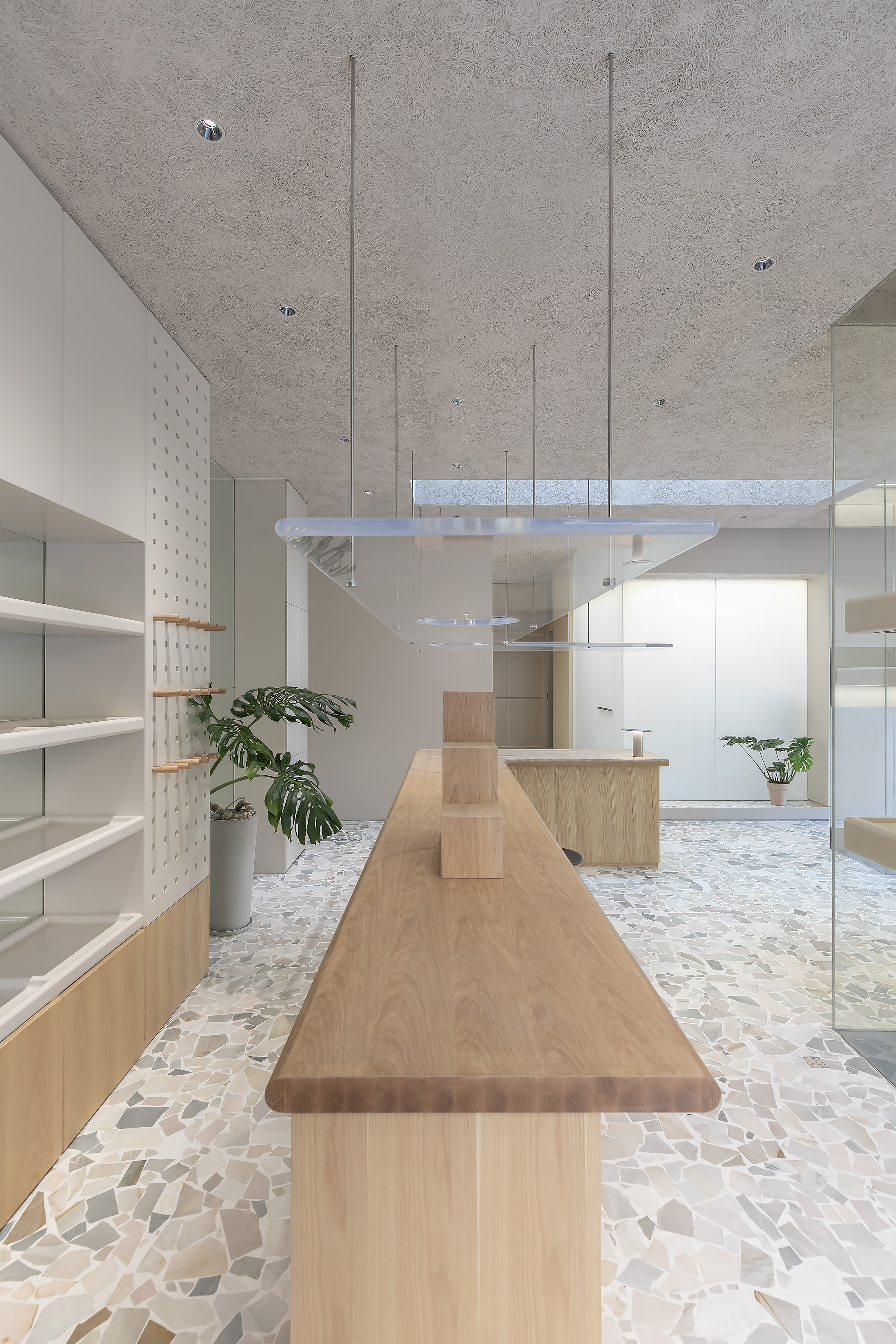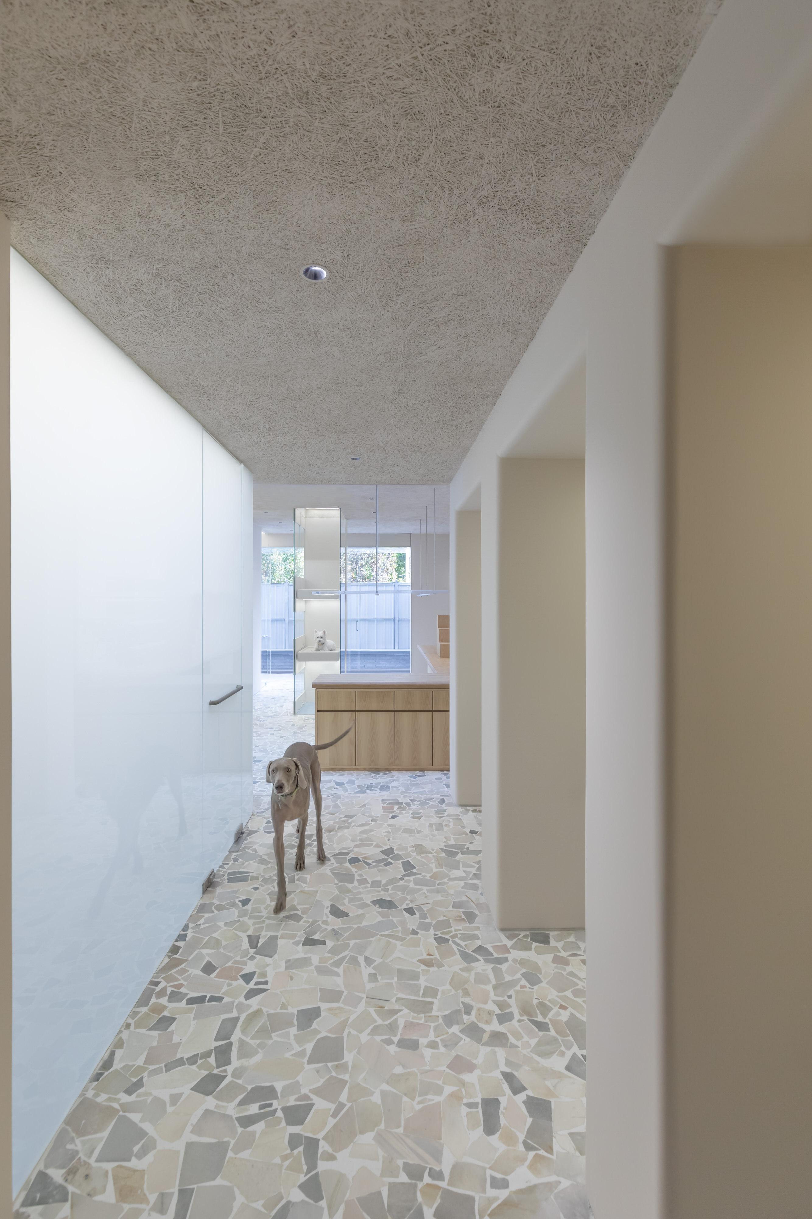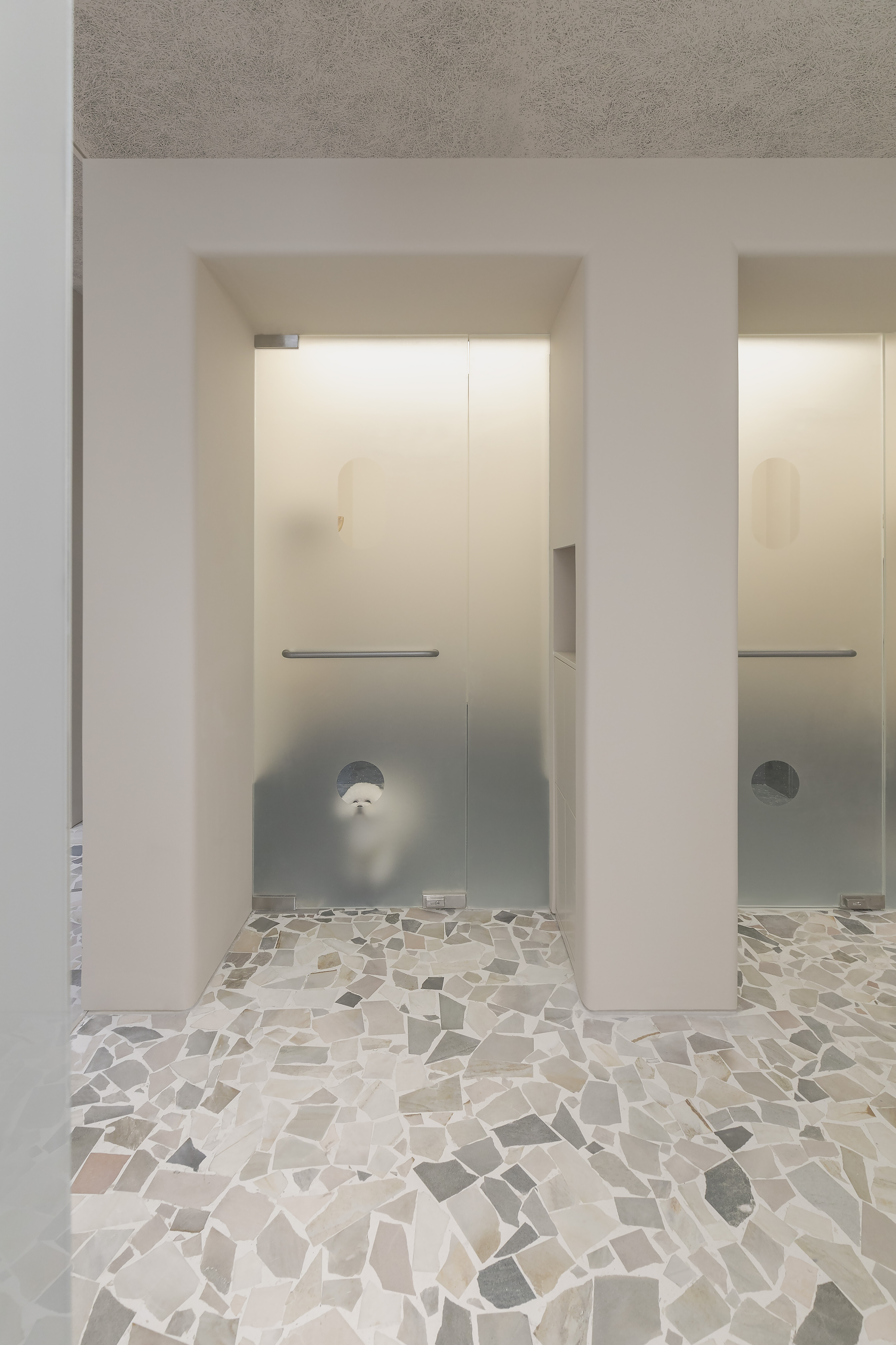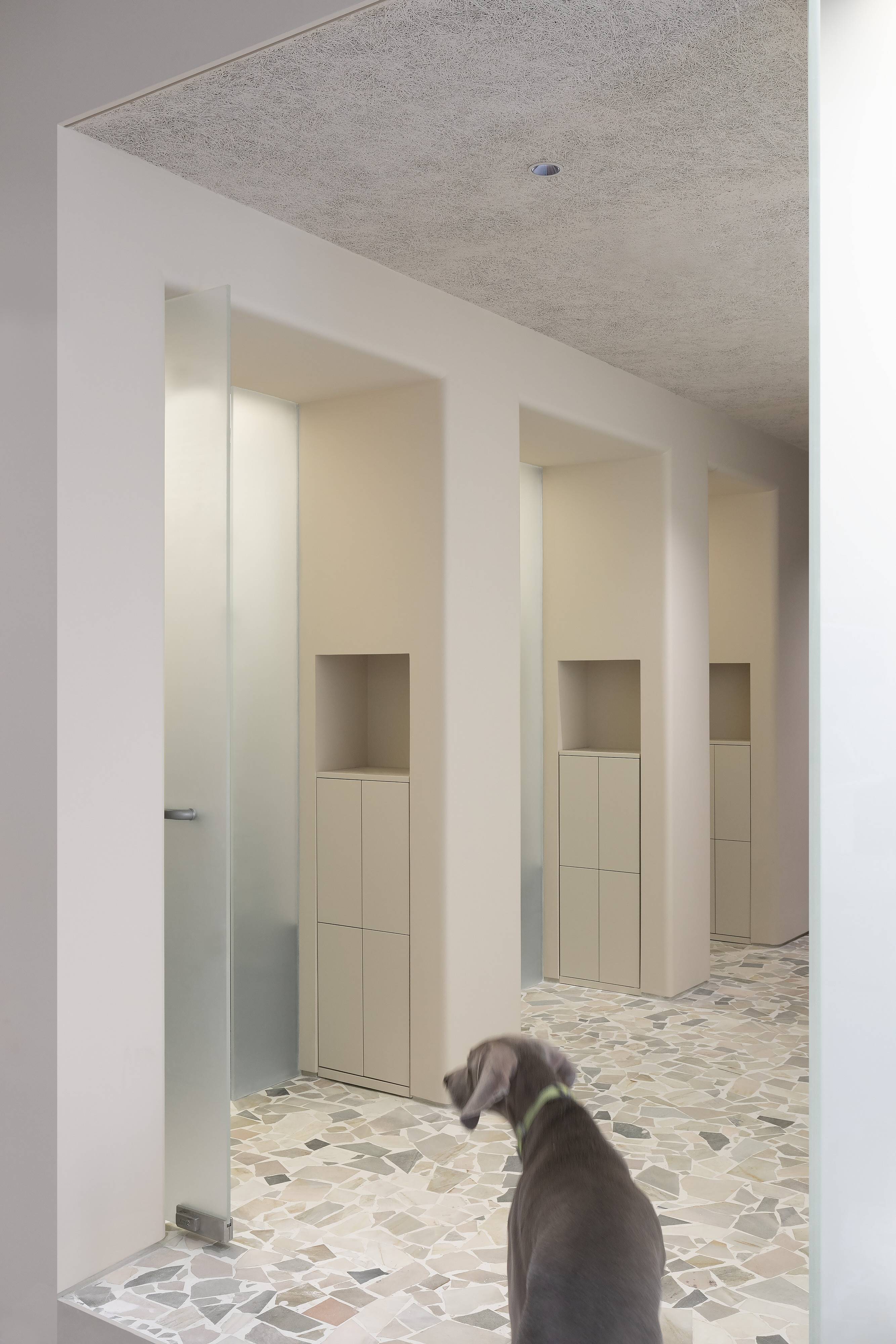 对Office AIO来说,宠物店不该是一个冷冰冰的交易场所或医院式的诊所中心。它是动物们短暂停留的地方,而他们也如人类一样有特定的偏好。宠物行业习惯将宠物作为产品,放在路人经过的店面后,招徕路人的关注。对于活生生的动物而言,这些关注实际上是一种不间断的打扰。为此,设计特意将宠物安置在远离外墙的玻璃体中,全层高的电磁玻璃既可分为不同的“楼层”让宠物们安静地憩息,也从内遮蔽行人的注视。设计并不旨在满足好奇的消费者,而是将动物们奉为首要的客人。