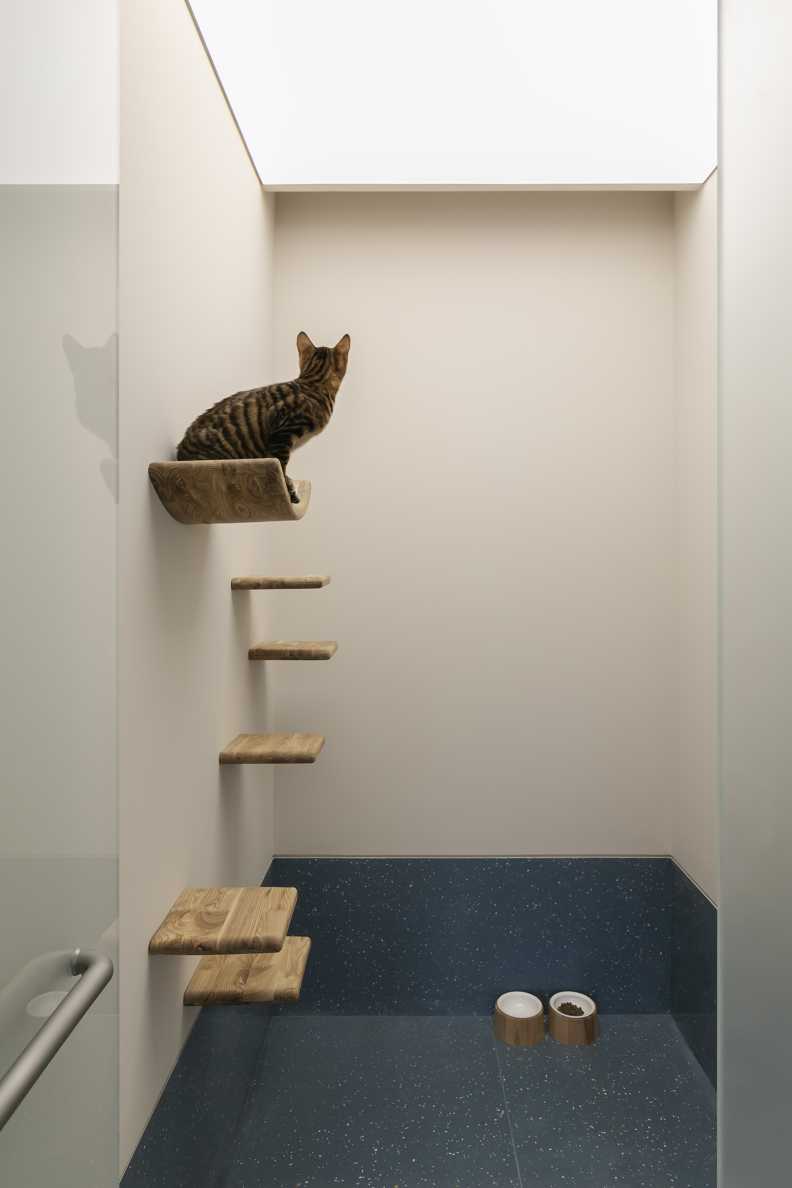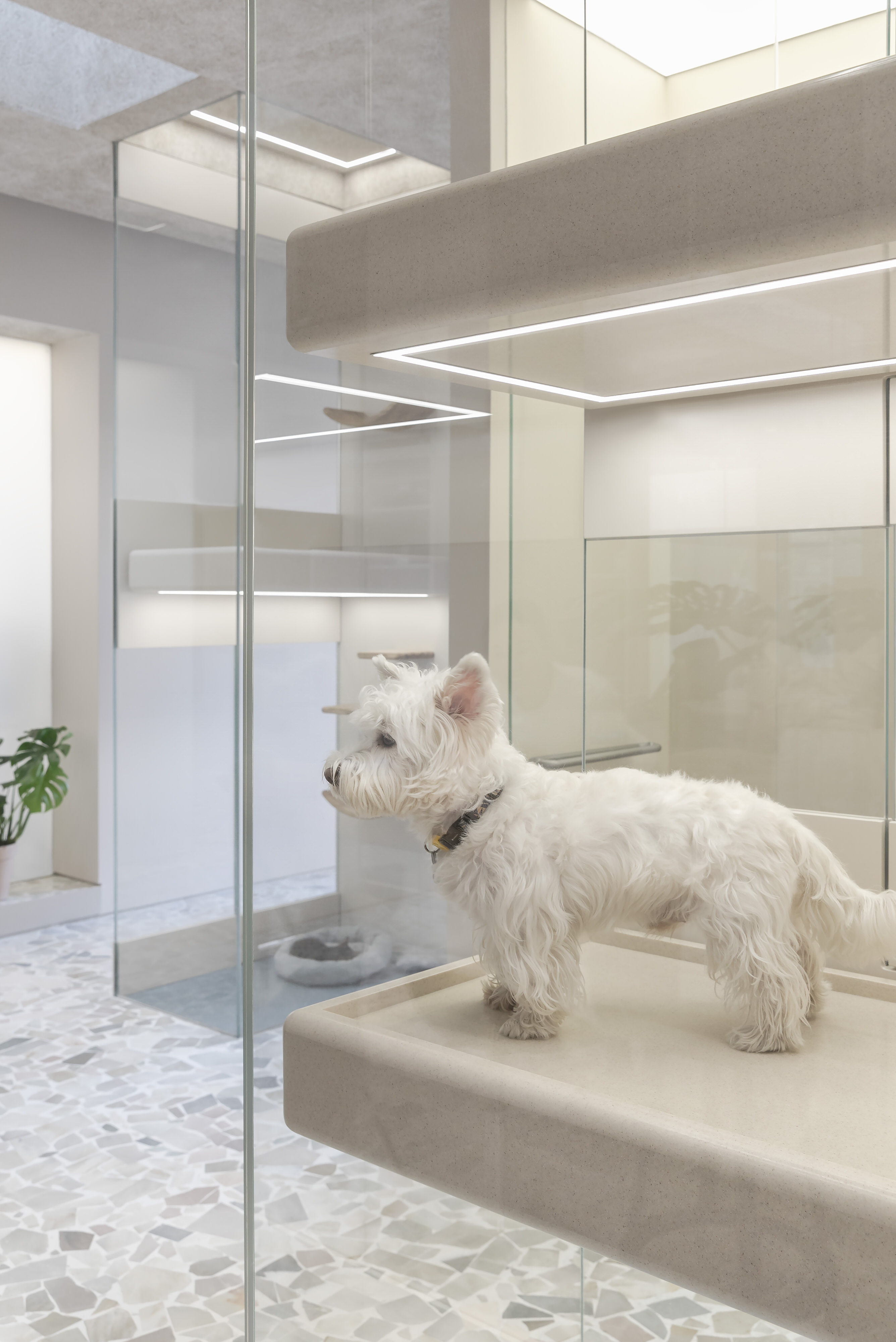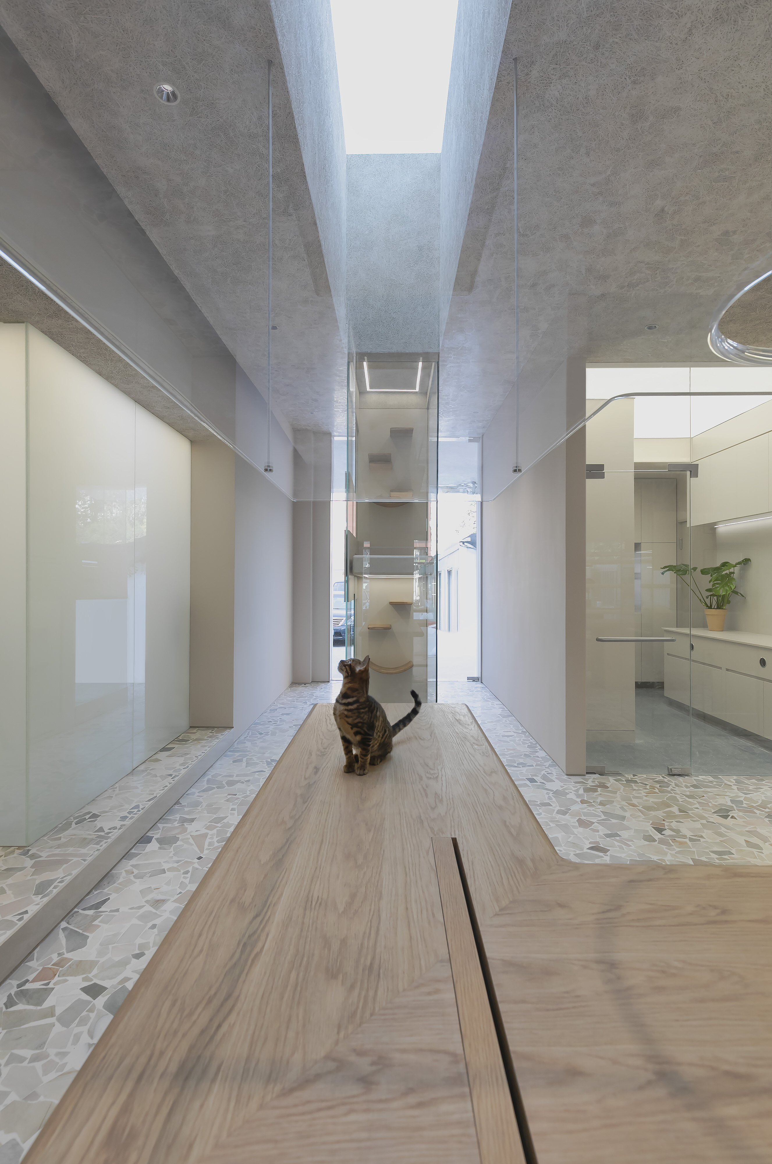 宠物狗们的入口在店南侧,而猫则在东侧。不同类的宠物和它们的主人在不同的区域通行,避免了动物之间可能发生的对峙和过道的拥挤。地面之上,猫咪们可以自由攀爬,上至他们专属的游戏区,一块仿佛漂浮在空中的亚克力板。店内的最深处,是连排的“酒店”房间,让寄养的宠物们可以在更安静私密的环境内短暂居住。