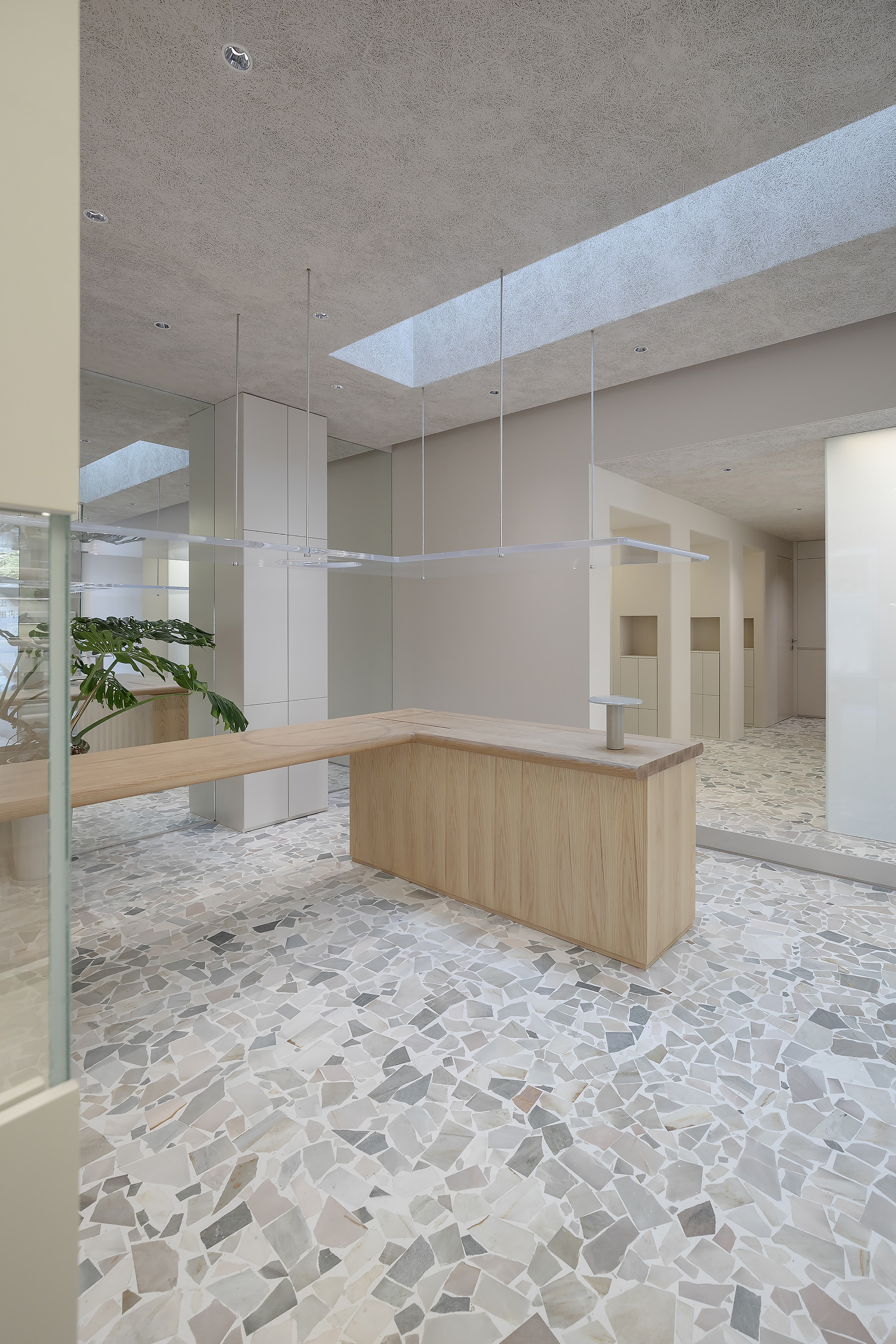 由于猫和狗仅有双色视觉,空间里选用的柔和色调能帮助他们区分Paw和城市场景,让宠物入店时能感受到他们进入了一个独特舒适的环境。店内的主要功能空间采用蓝色水磨石地板,而米色的可丽耐板则用于展示区、寄养区和护养区,以便维护。木制桌子和柜台则为公共区域增添了和缓的氛围。