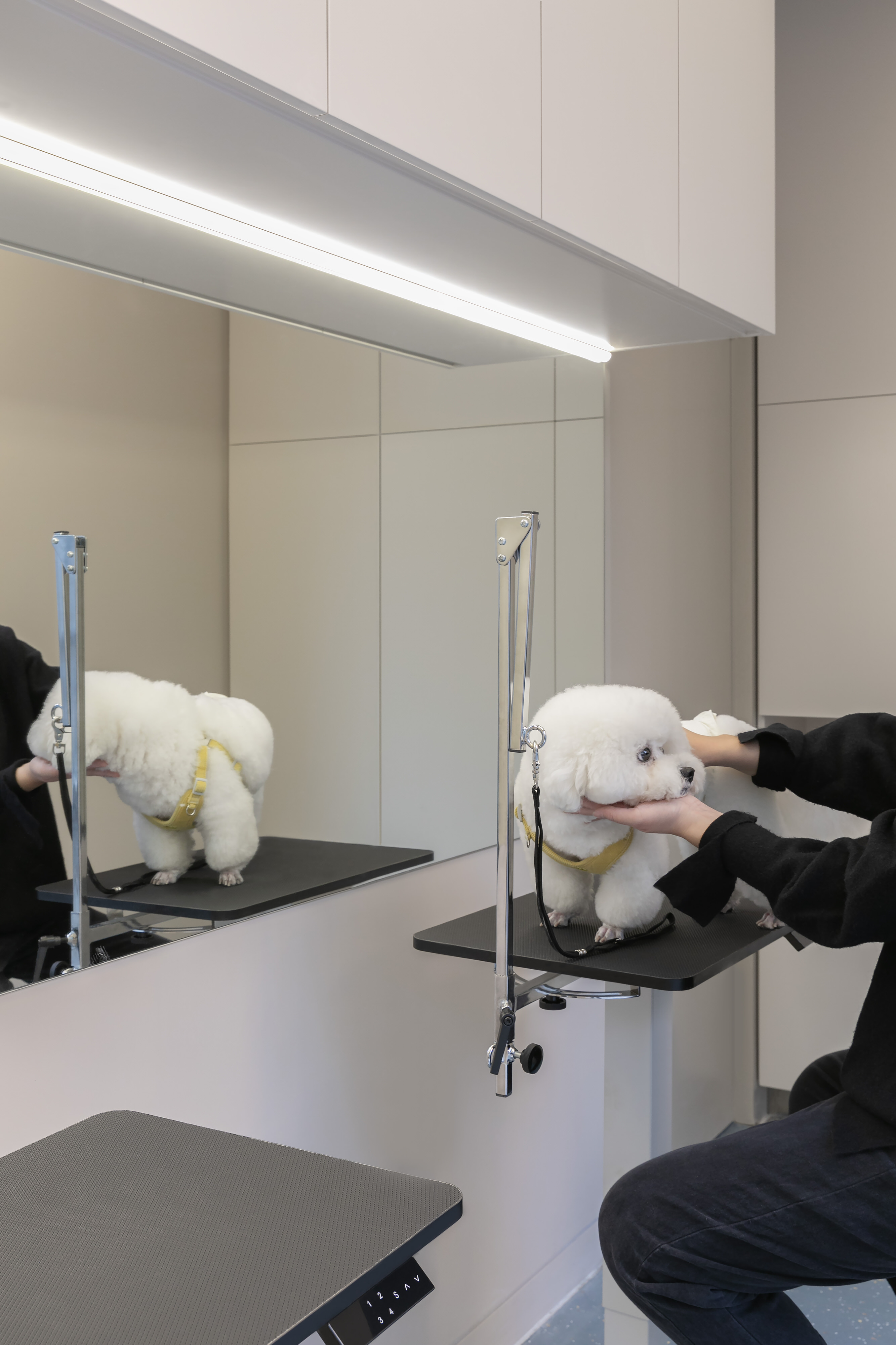 尽管占地面积不大,团队还是细心地规划出了狗和猫各自的道路,以减少两个不同物种之间的冲突。店里提供了猫和狗各自的区域,包括独立的入口、接待区和护理台。悬臂桌的两端分别是不同类宠物的接待台,一体的L型设计在规避宠物摩擦的同时,也保证了桌后工作人员的通行便利。