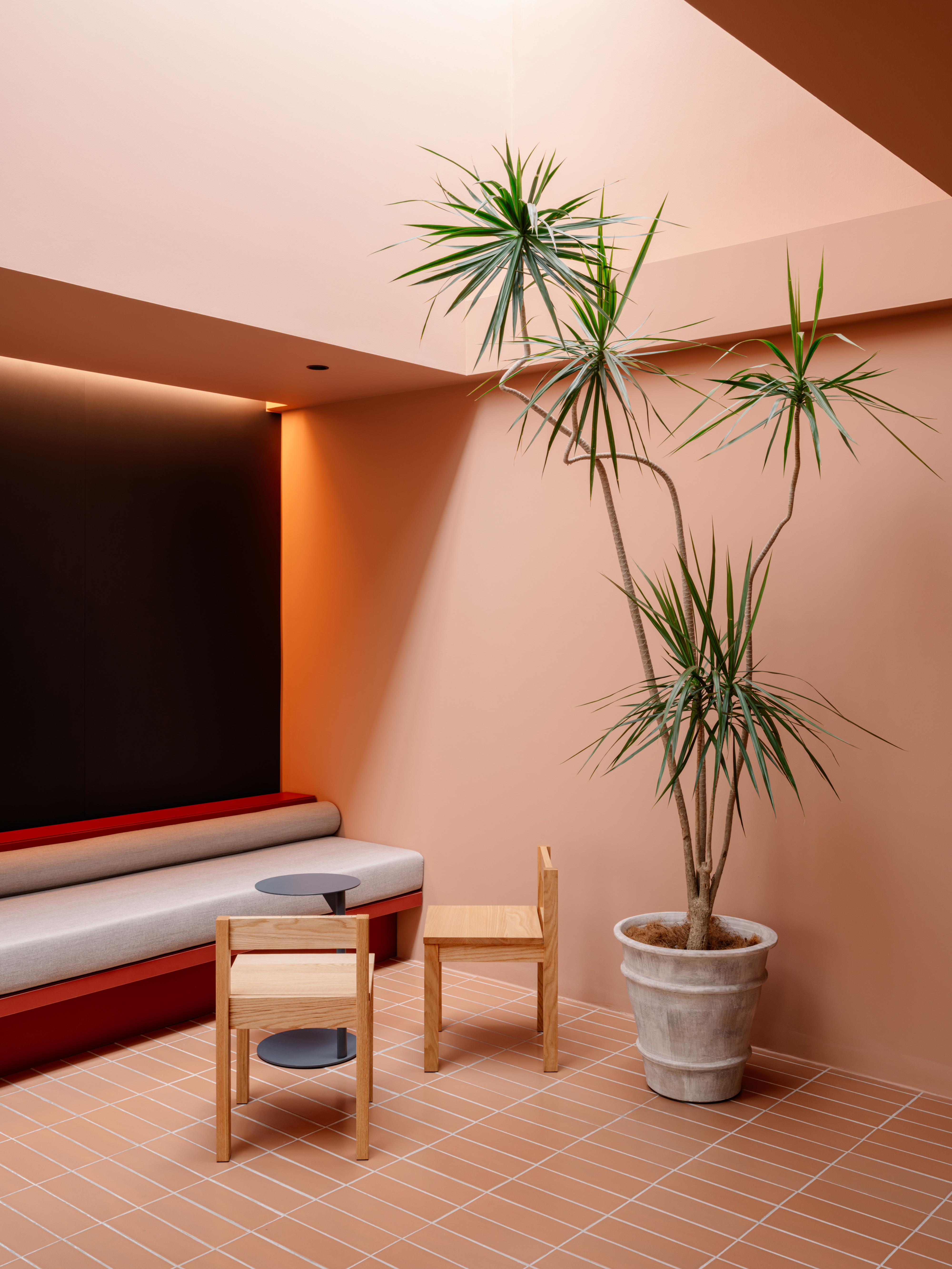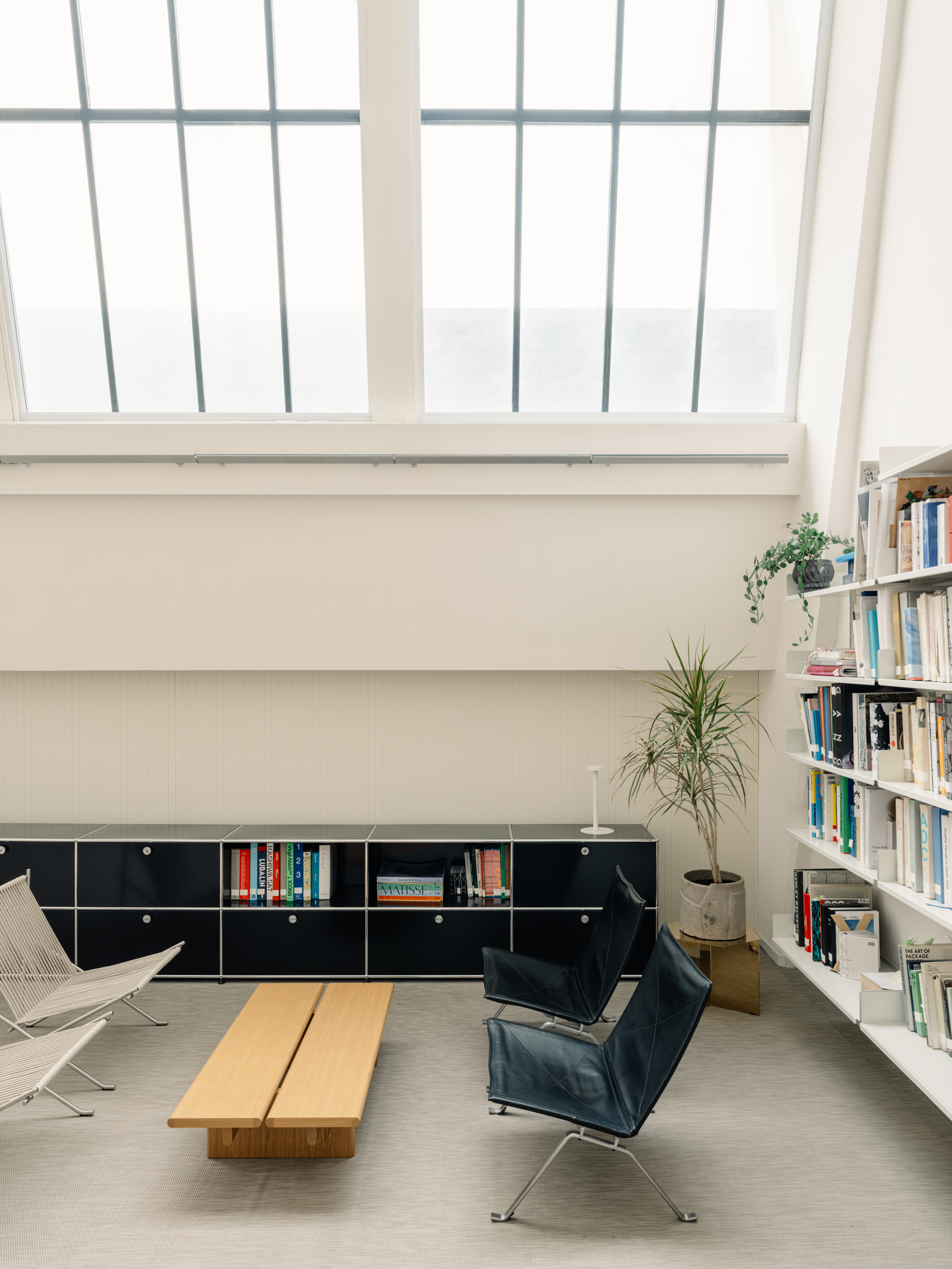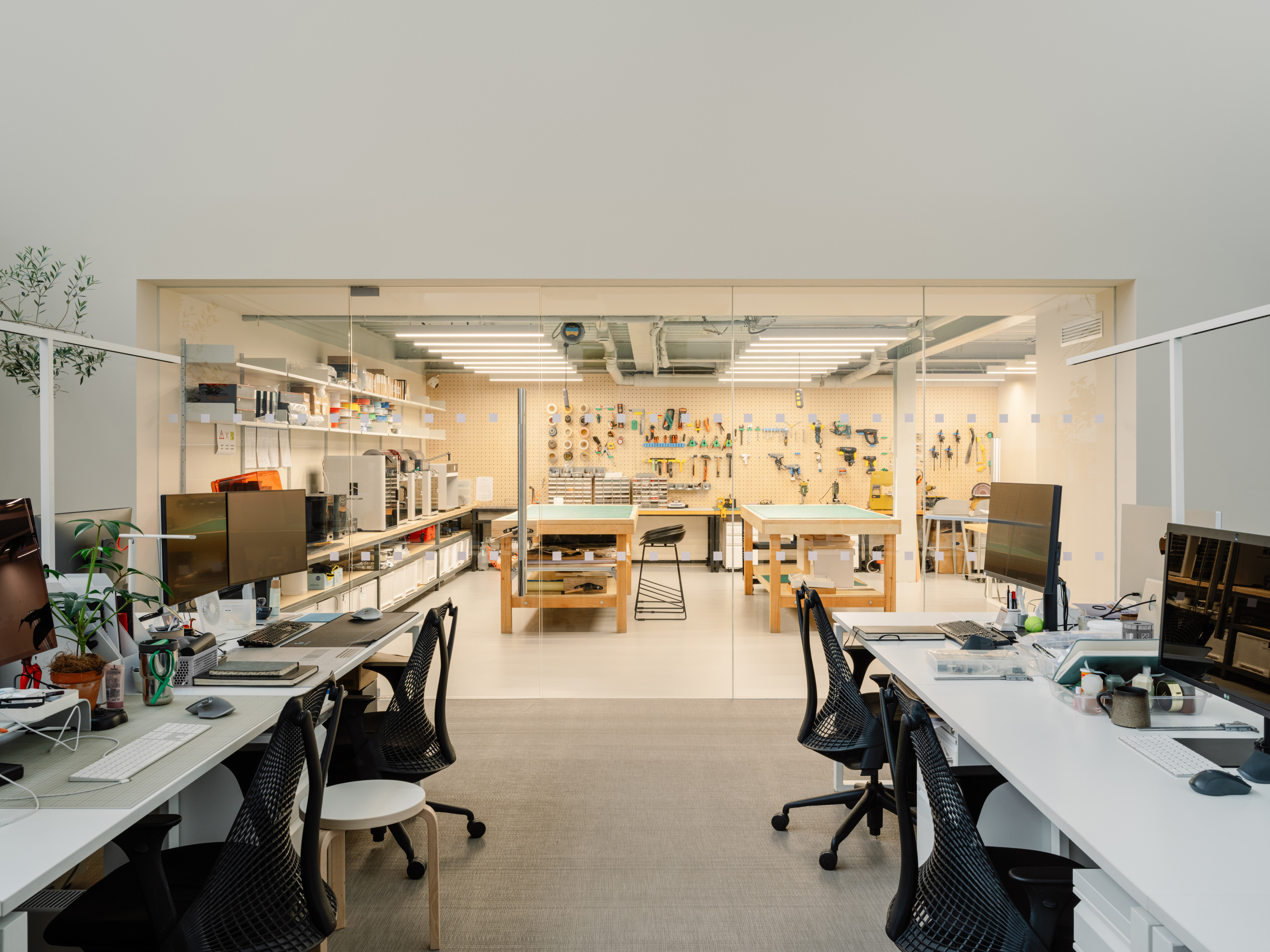 空间另一端嵌入的第二个体量内,带有通透玻璃的CNC工作坊成为视觉与功能的锚点。所有设计制作、打样、验证的环节在共享环境中始终保持可见。两个体量之上各增设了阁楼层,承载三间会议室(分别对应各团队)及档案室。这些房间整体抬高于主层,既保障了会议的私密性,也充分利用了高侧窗引入的自然光,给予沟通讨论一个柔和的背景。