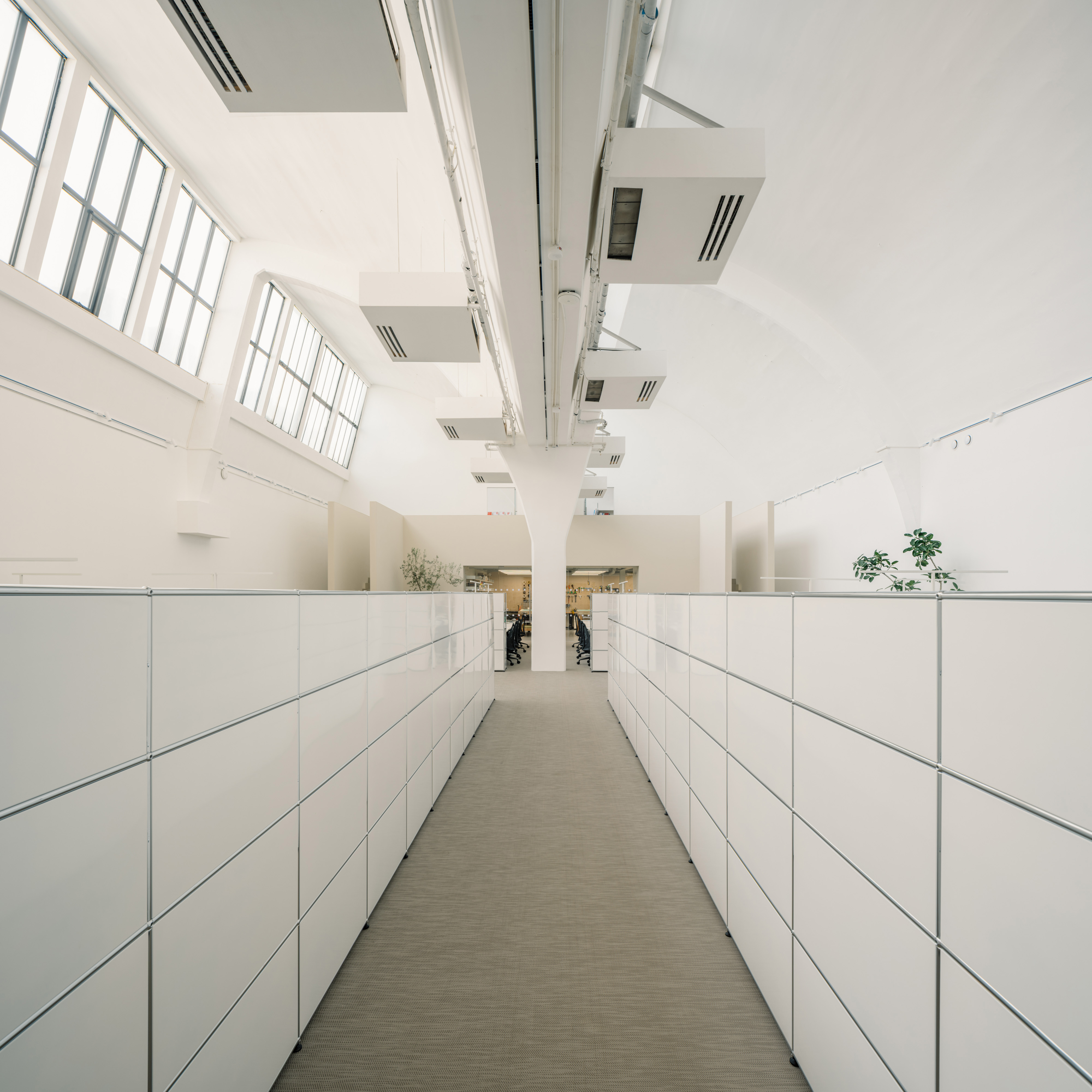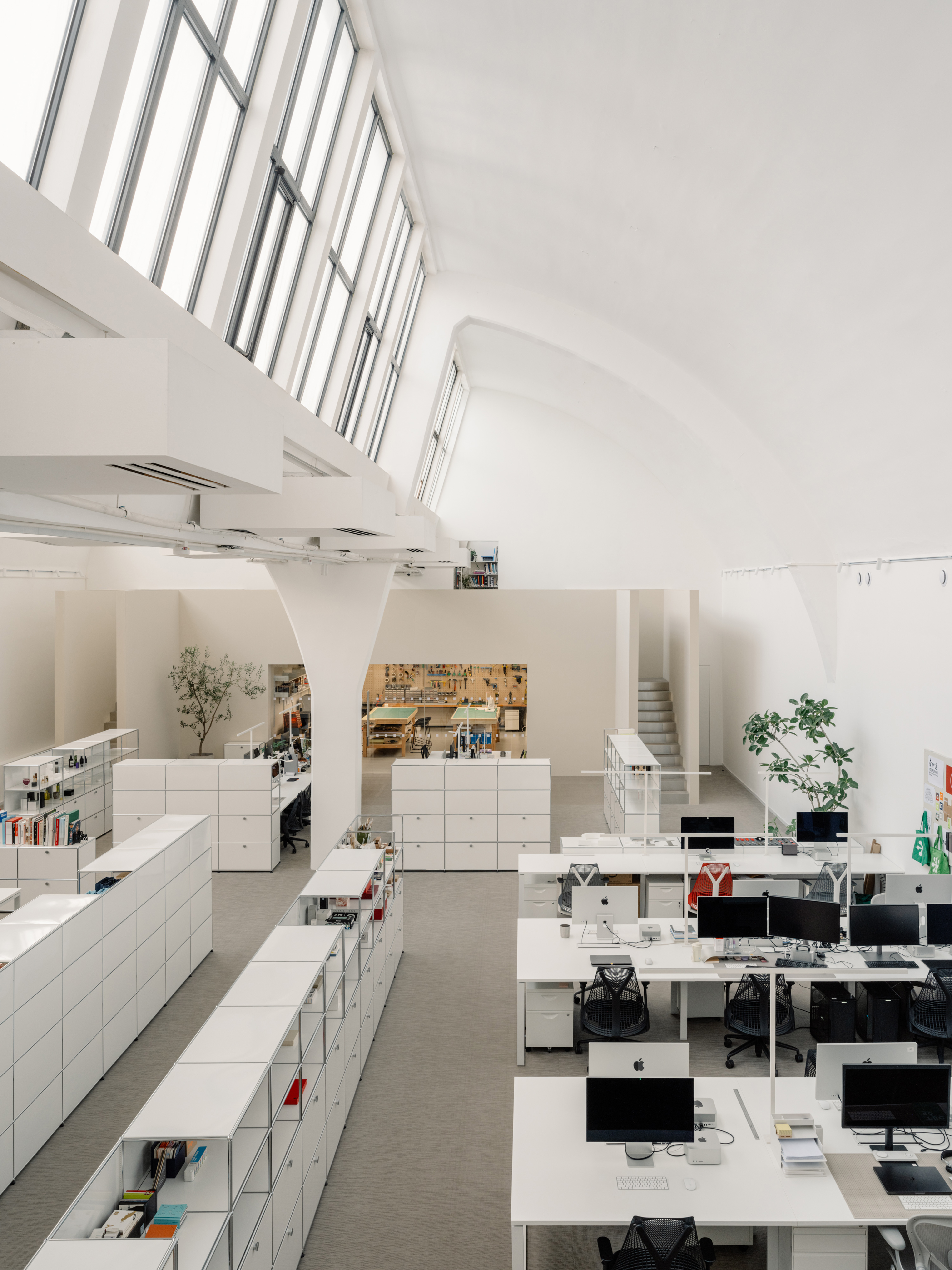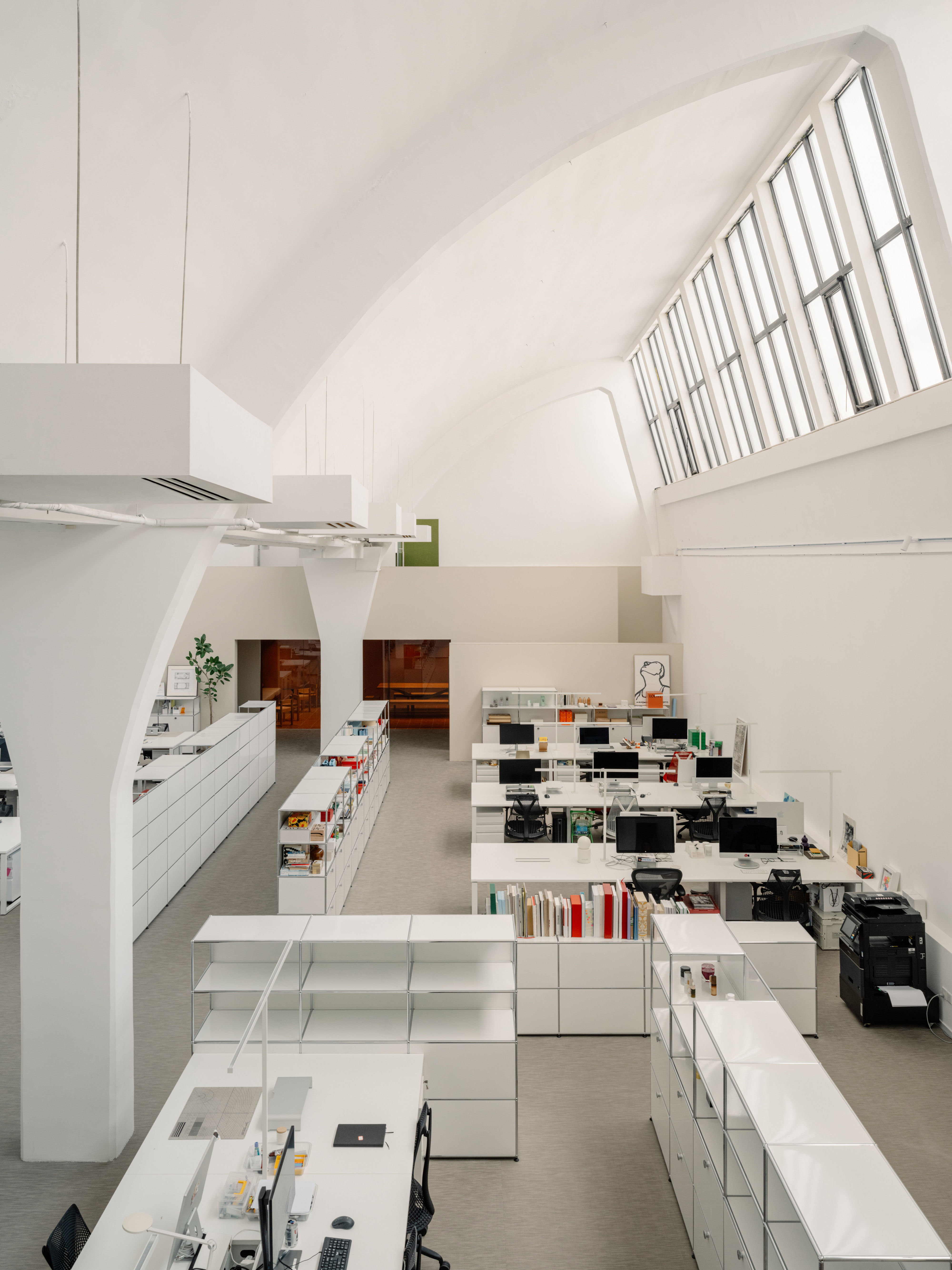 办公室占据原厂房建筑的一节,整体空间比例呈狭长的矩形(37米长、14米深),并有着标志性的双拱屋顶结构以及Y形结构。锯齿状屋顶北侧的采光玻璃窗,为室内提供不间断的柔和日光,其确立的强烈秩序感与开放性,成为空间设计最关注的元素。照明设计则选择了Ostuni 的 Tango 桌灯贯穿整个空间,均匀点亮所有的工作台面,也利用其上照功能,柔和地照亮整体空间。