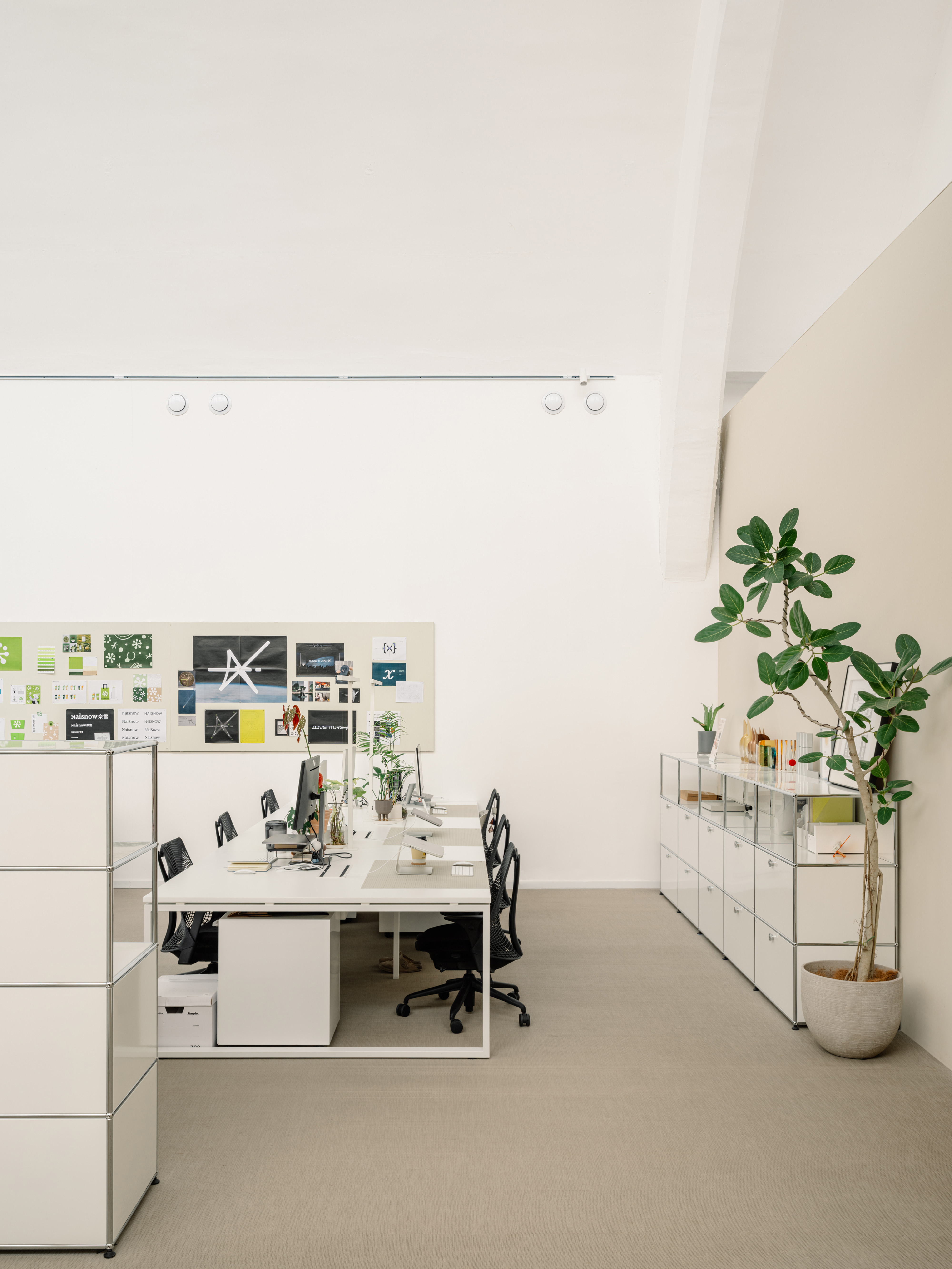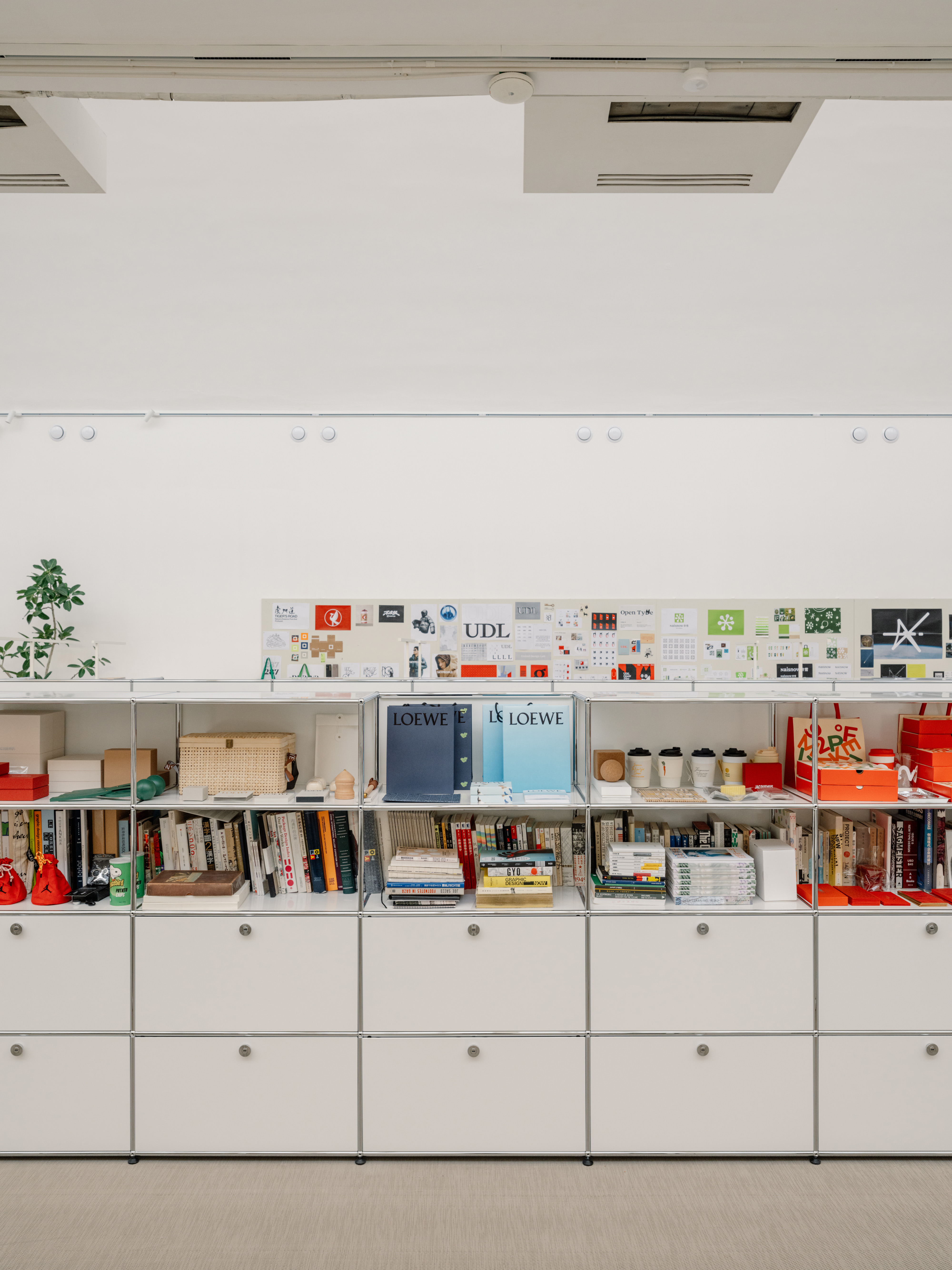 通过将辅助功能空间压缩集中,原有工业空间的开阔的空间感得以完整地呈现给主办公区。中央轴线上的结构柱自然划分出大空间区块:两个负责品牌设计的平面团队分别占据南北两侧,延展墙面用于张贴设计稿与设计讨论过程。工业设计团队则坐落于东端,紧邻工作坊。这三个团队之间,以模块化的组合系统柜划分工作区域、保持了整体空间的开放性、支持着空间内部的动线、储物、展示、及非正式讨论功能。