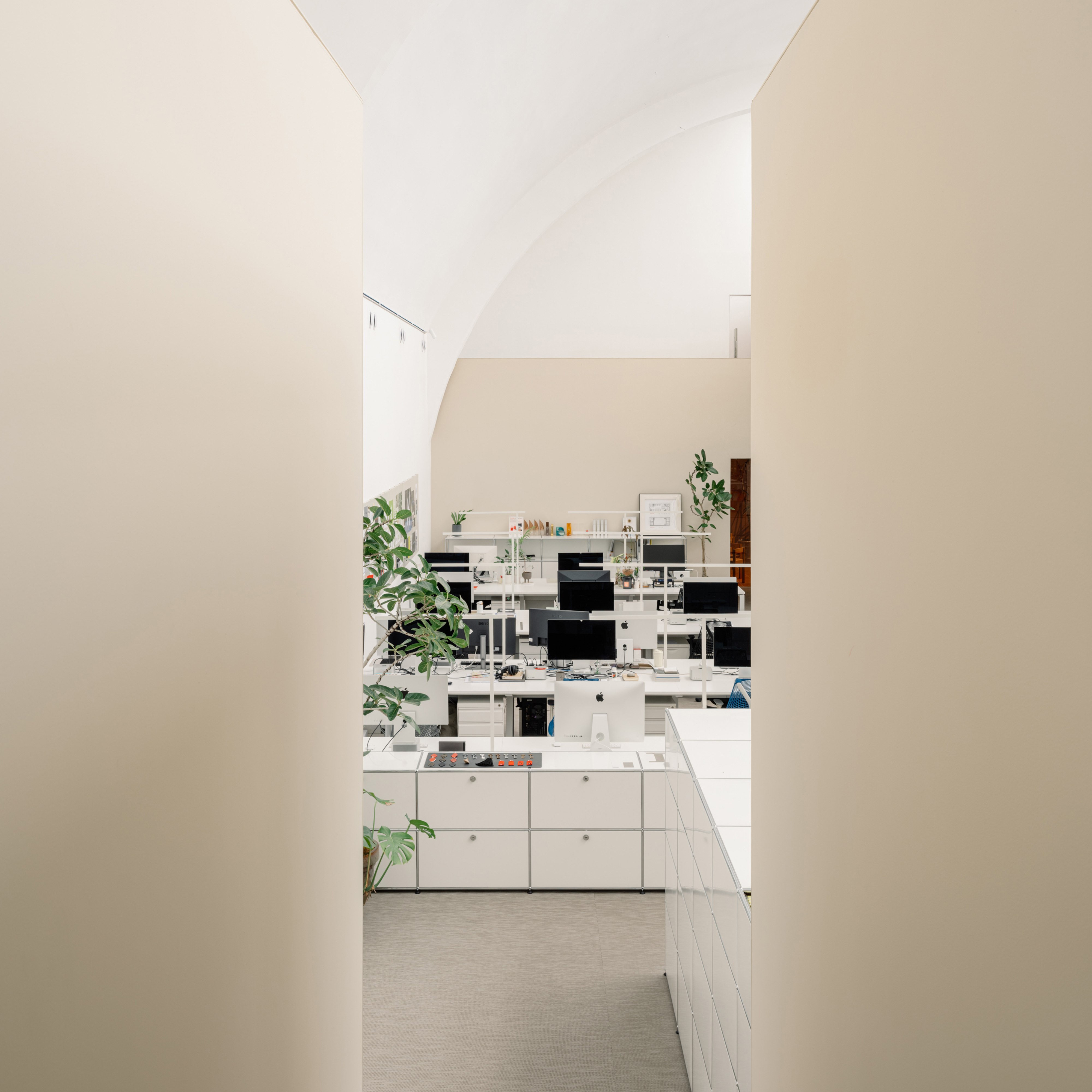 在低调的铝板外立面上,唯有一面旗帜昭示着工作室的入口。抵达的体验被整体纳入首个嵌入式空间集中体量:从旋转中轴门步后,进入UDL空间的序列:沿着连续压缩的空间动线,依次经过自行车存放区、衣帽间、兼作访客等候与聚会空间的茶歇区。 经过这一系列刻意压缩高度的入口空间后,动线豁然打开,进入全挑高的主工作区,令人充分感受公共区域到共享工作环境的渐进过渡。